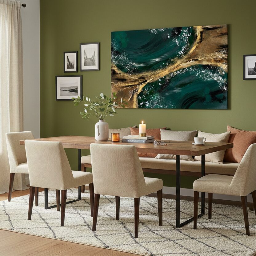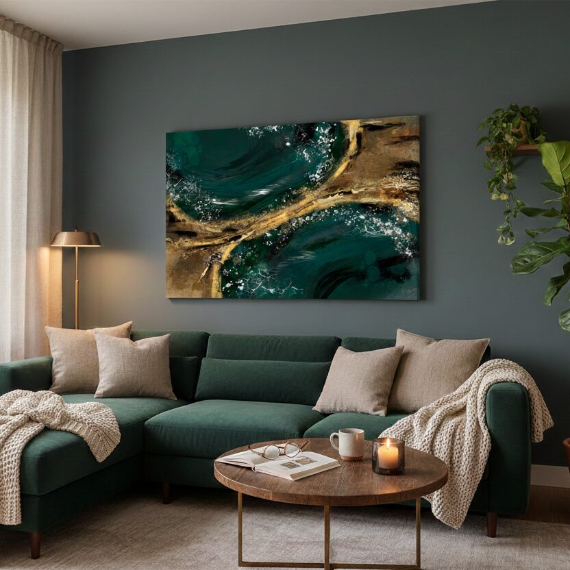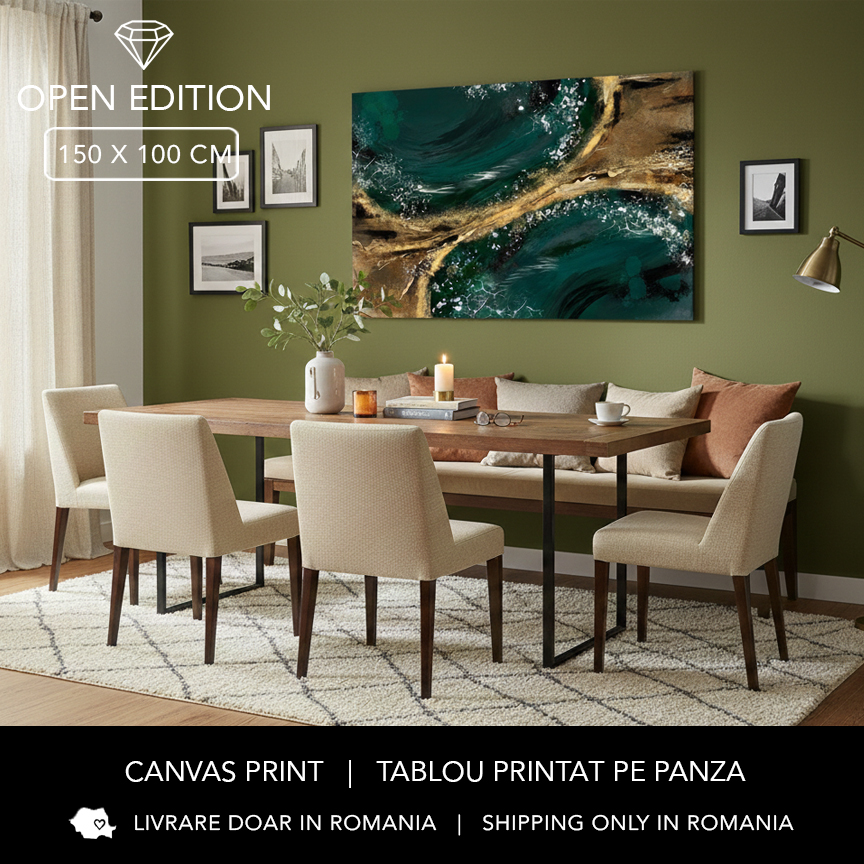 Adauga o nota de lux si profunzime locuintei tale cu „Emerald Echo”, o opera de arta moderna unde verdele smarald se intalneste cu texturi aurii vibrante. Aceasta lucrare nu este doar un simplu print, ci o experienta vizuala tactila, menita sa devina punctul central al oricarei incaperi.
