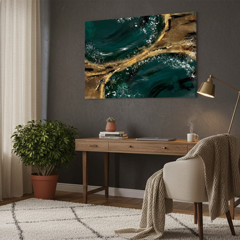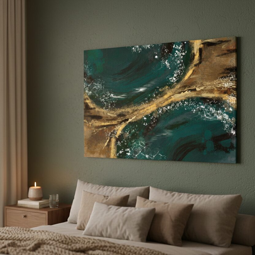 „Emerald Echo” – Premium Hand-Embellished Canvas Print A stunning fusion of emerald greens and golden textures, „Emerald Echo” is more than just a print. After the printing process on high-quality matte canvas, I personally add hand-painted brushstrokes to each piece. This creates a unique 3D texture, giving the artwork depth and the authentic feel of an original painting.