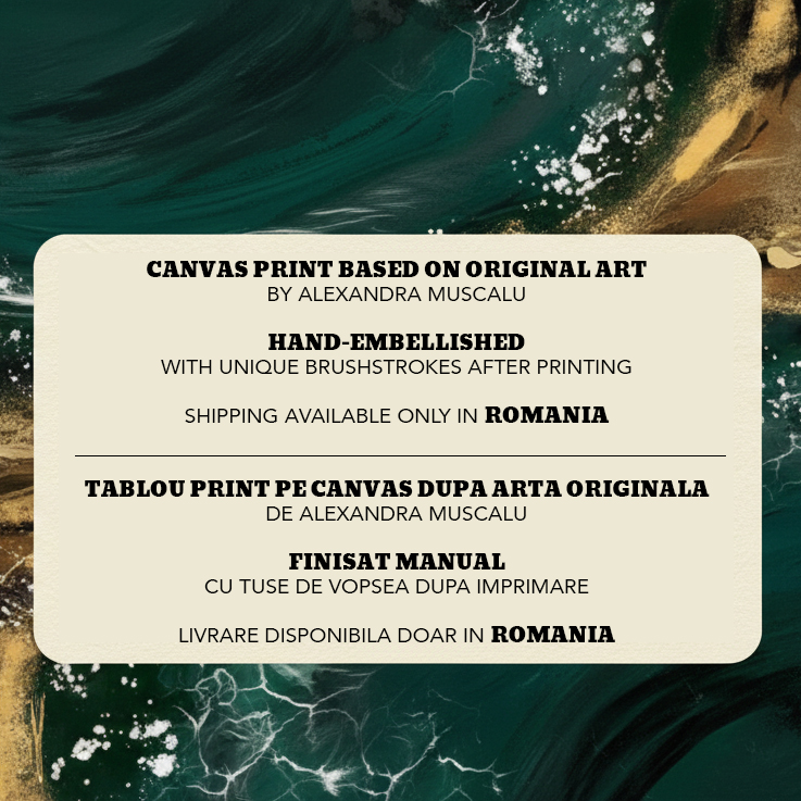 Originalitate prin Detalii 3D: Dupa procesul de imprimare, fiecare tablou trece prin mainile artistului. Voi adauga personal tuse de vopsea si textura (brushstrokes) peste elementele cheie, oferind lucrarii un efect 3D si acea vibratie autentica de pictura pe panza. Fiecare exemplar devine, astfel, unic.