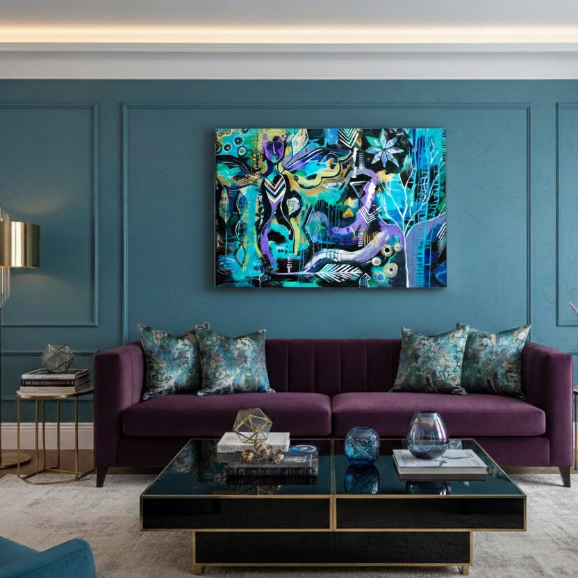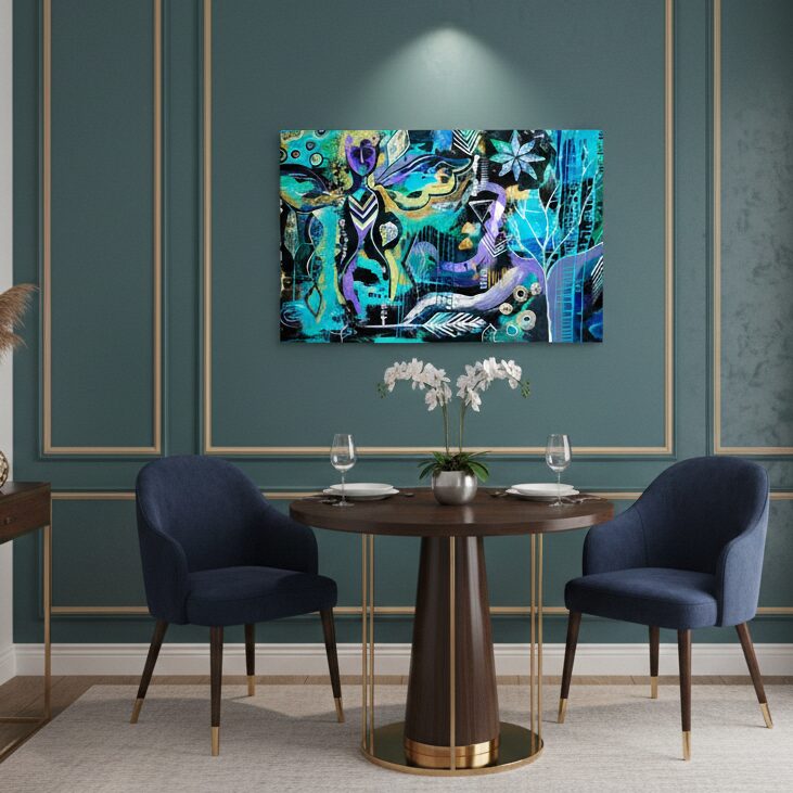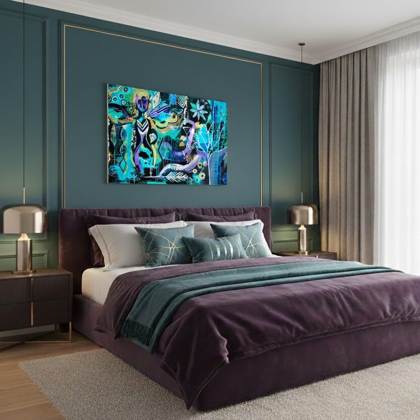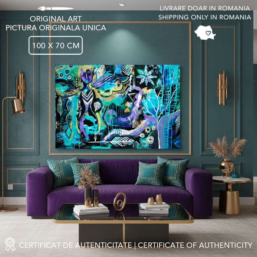 Energia lucrarii: Profunzime si Claritate Regala „The Royal Blue” este o invitatie la introspectie si liniste profunda. Dominata de un albastru regal hipnotic si detalii vibrante de turcoaz si auriu, aceasta lucrare de mari dimensiuni capteaza esenta misterului si a echilibrului interior. Este o piesa care „ancoreaza” camera, aducand o stare de calm si autoritate spirituala prin straturi complexe de textura si simboluri intuitive.